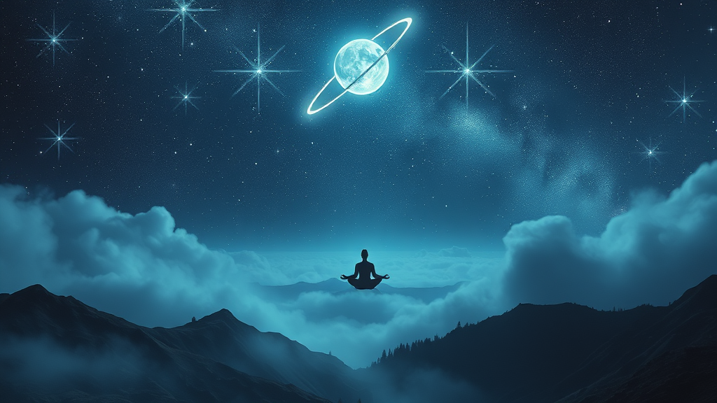 In the dreamscape of midnight thoughts, meditation reveals itself as both the journey and the guide, where whispers of silver flow through the air, painting the dark indigo sky with ethereal strokes. Celestial bodies drift in misty veils, casting an otherworldly glow upon surreal landscapes. Figures in unconventional poses float amidst the stars, embodying the hidden rhythms of the cosmos. The essence of meditation, a secret dance between reality and imagination, unfolds in this celestialpunk realm, a place where the intangible becomes visible, and silence sings its own song.