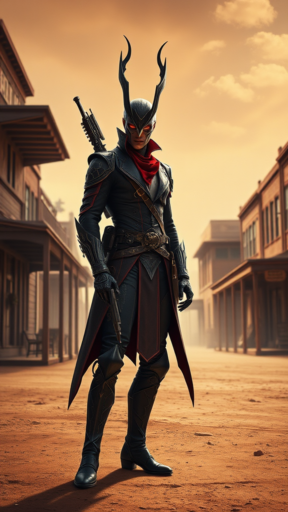 In the dusty and desolate street of a forgotten Wild West town, High Noon Jhin stands poised in a hyper-realistic photograph. His slender, agile physique is accentuated by an intricately designed costume that blends seamlessly with his enigmatic presence. The advanced lighting techniques cast dynamic shadows, underlining the exquisite details of his signature gunpowder weapons. His stoic and determined expression reveals a deep sense of justice and retribution, as if heβs an enigmatic figure on a righteous mission. The warm, earthy color palette, punctuated by striking reds, lustrous golds, and inky blacks, evokes the searing heat of the high noon sun and the timeless frontier spirit. High Noon Jhin is captured in a moment of silent intensity, embodying the essence of a relentless pursuer of justice amidst the barren landscape.