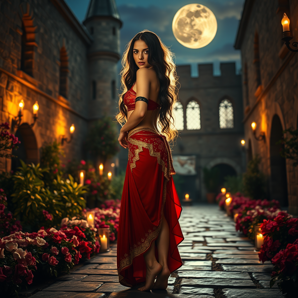 In the enchanting courtyard of a medieval castle at dusk, a mesmerizing beauty stands surrounded by vibrant blossoms, her gaze inviting and captivating. She is adorned in an exquisite red and gold belly dancer's outfit, aglow under the interplay of radiant full moonlight, flickering torches, and gentle candlelight. The illumination creates a magical aura as she poses barefoot, the light highlighting her elegant silhouette and her sensuous posture. Her hip-length, wavy raven hair cascades down her back and shimmers with soft, diffused light, adding an ethereal quality to her presence. Around her neck, a graceful black band enhances the air of mystery. Captured with a Leica M10 and Helios-44 58mm f/2 lens, adjusted to F2.8, this fine art photograph reveals rich, deep tones and exquisite highlights. The midday sun meticulously defines her radiant expression, while moonlight delicately outlines her figure. Her back faces the camera, yet she glances over her shoulder with an inviting allure, drawing the viewer into the scene.