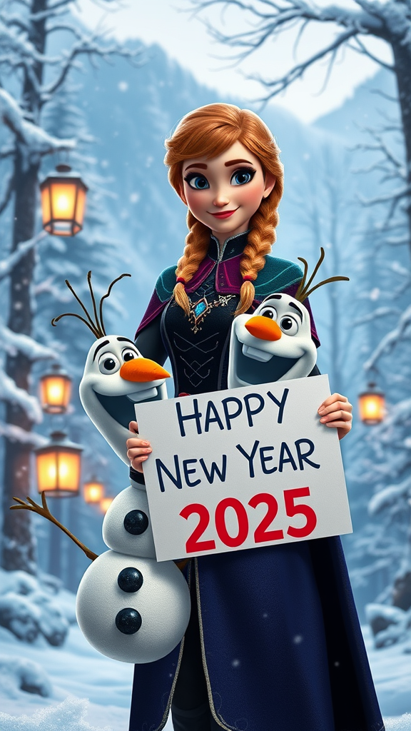 In the enchanting snowy landscape of Arendelle, Princess Anna stands with a bold and daring presence, embodying her spirited and adventurous personality. Her sophisticated and slightly daring version of her iconic outfit shines with a high-shine finish, complemented by modern accents that highlight her confidence and charm. Her signature pigtails elegantly frame her face, with subtle references to the North Mountain visible in the background. Beside her, Olaf the snowman exudes joyful warmth, together holding a sign that reads "Happy New Year 2025." The softly lit winter forest surrounds them, with shimmering snowflakes gently falling and the warm glow of lanterns casting a magical ambiance over the scene. The photo captures the essence of enchantment and celebration in a breathtaking moment, showcasing both characters in a highly realistic and seductive portrayal.
