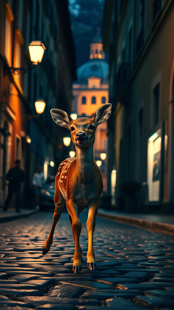 In the enchanting streets of Rome under the glow of mysterious dark lights, a playful baby deer frolics with unbridled joy, its laughter echoing through the ancient city. The scene is captured in a cinematic, hyper-realistic style with exquisite detail, showcasing the deer's delicate features and the intricate textures of the cobblestone streets. The vibrant energy of the deer contrasts beautifully with the historic backdrop, all rendered in stunning 4k resolution.
