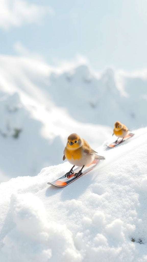 In the fluffy hills of the Marshmallow Mountains, tiny sparrow folk gracefully glide on their snowboards, weaving through the cloud-like landscape with a blend of finesse and playful delight.