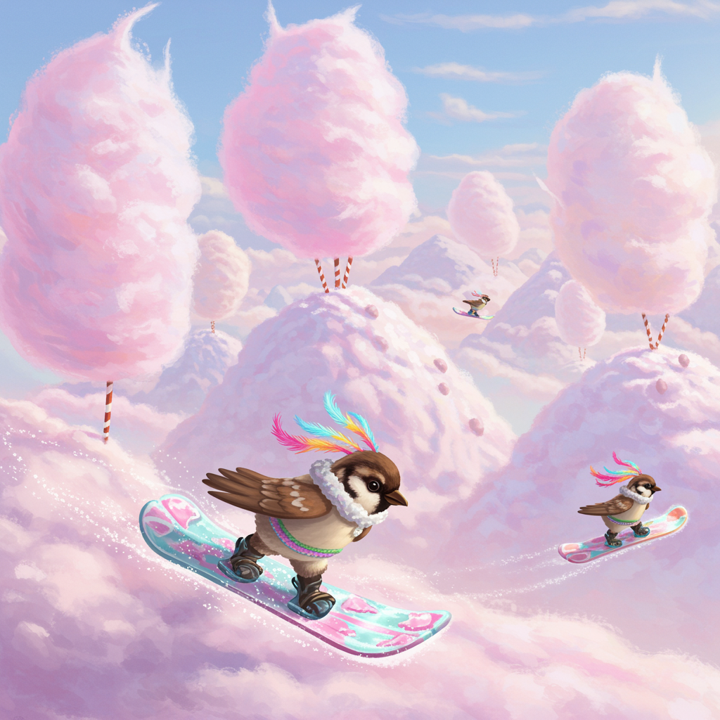 In the fluffy peaks of the Cotton Candy Hills, sparrow folk glide on sugar-dusted snowboards, their wings catching the sweet, crisp air.