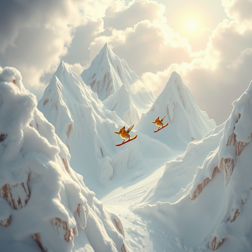 In the fluffy peaks of the meringue mountains, tiny sparrow folk gracefully glide on their snowboards, weaving between fluffy clouds and sugar-coated slopes.