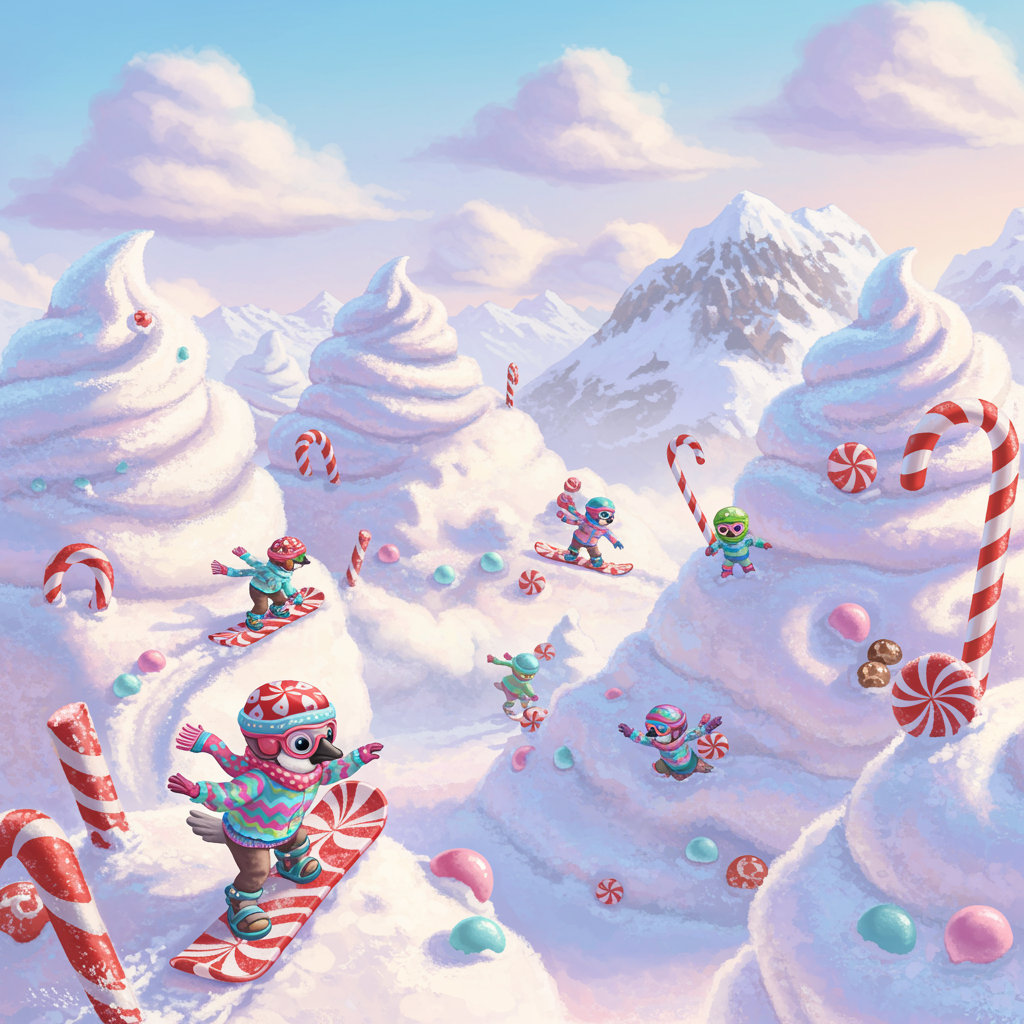 In the fluffy peaks of the Whipped Cream Mountains, sparrow folk glide on their peppermint snowboards, weaving through the clouds of confectioner's sugar.