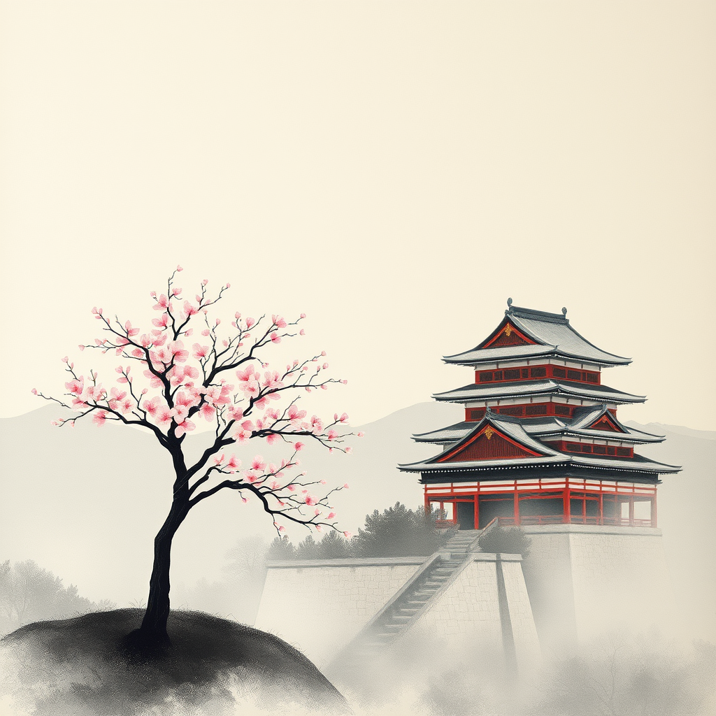 In the foreground, a solitary sakura tree stands with its delicate blossoms on a serene hill, while in the background, a traditional Japanese castle in hues of black and red looms majestically. The scene is captured with the elegance of a scroll painting, utilizing the minimalist strokes of a sumi-e drawing. The atmosphere is tranquil and timeless, echoing the emotive style of Luis Royo, devoid of any human presence, focusing purely on the harmony between nature and architecture.