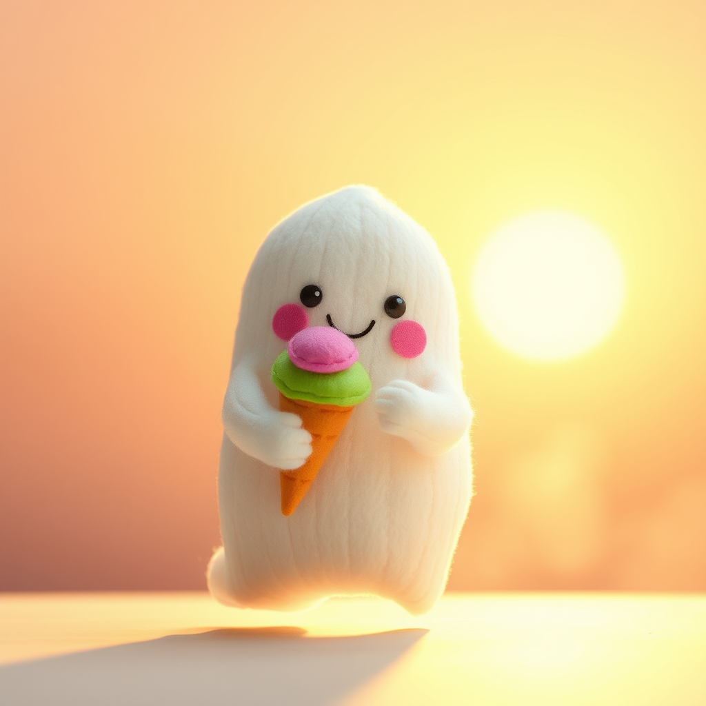 In the gentle glow of a pastel sunrise, a small, plump ghost made of the softest, most huggable felt stands with an expression so heartwarming it could thaw the iciest of souls. Its tiny hands clutch a colorful ice cream cone, dripping slightly in the morning light. The ghost’s joyful smile radiates an infectious happiness, and its beady eyes twinkle with childlike wonder, gazing into the camera as if inviting you to share in its simple delight. Around it, the air is filled with an intangible sweetness, a blend of felt warmth and pure joy, creating an atmosphere so tender it feels as though hearts are floating, lightly caressed by the gentle, rosy hues of dawn. The scene is suffused with a sense of serene camaraderie, where softness meets sunshine, and all worries dissolve like morning mist.