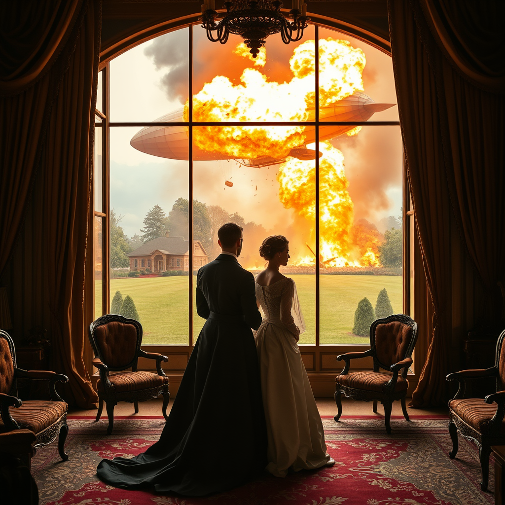 In the grand parlor of a majestic estate, a poised couple, impeccably attired in the finest 1800s fashion, stands resolute by an expansive window. The panoramic view, usually serene, now captures a scene of chaos as a blazing dirigible plummets towards their manicured lawn, erupting in a cacophony of flames and debris. Yet, amidst the turmoil, the couple remains unshaken, their countenances exuding a calm assurance and unwavering fortitude. Their poised stature, framed by the intricate details of vintage velvet drapes and ornate woodwork, contrasts starkly with the fiery pandemonium outside. The dramatic interplay of the couple's dignified calm against the backdrop of smoky chaos paints a vivid tableau of courage under siege. This scene elegantly marries the grace of historical refinement with the breathless urgency of impending disaster, underscoring the timeless resilience of the human spirit.