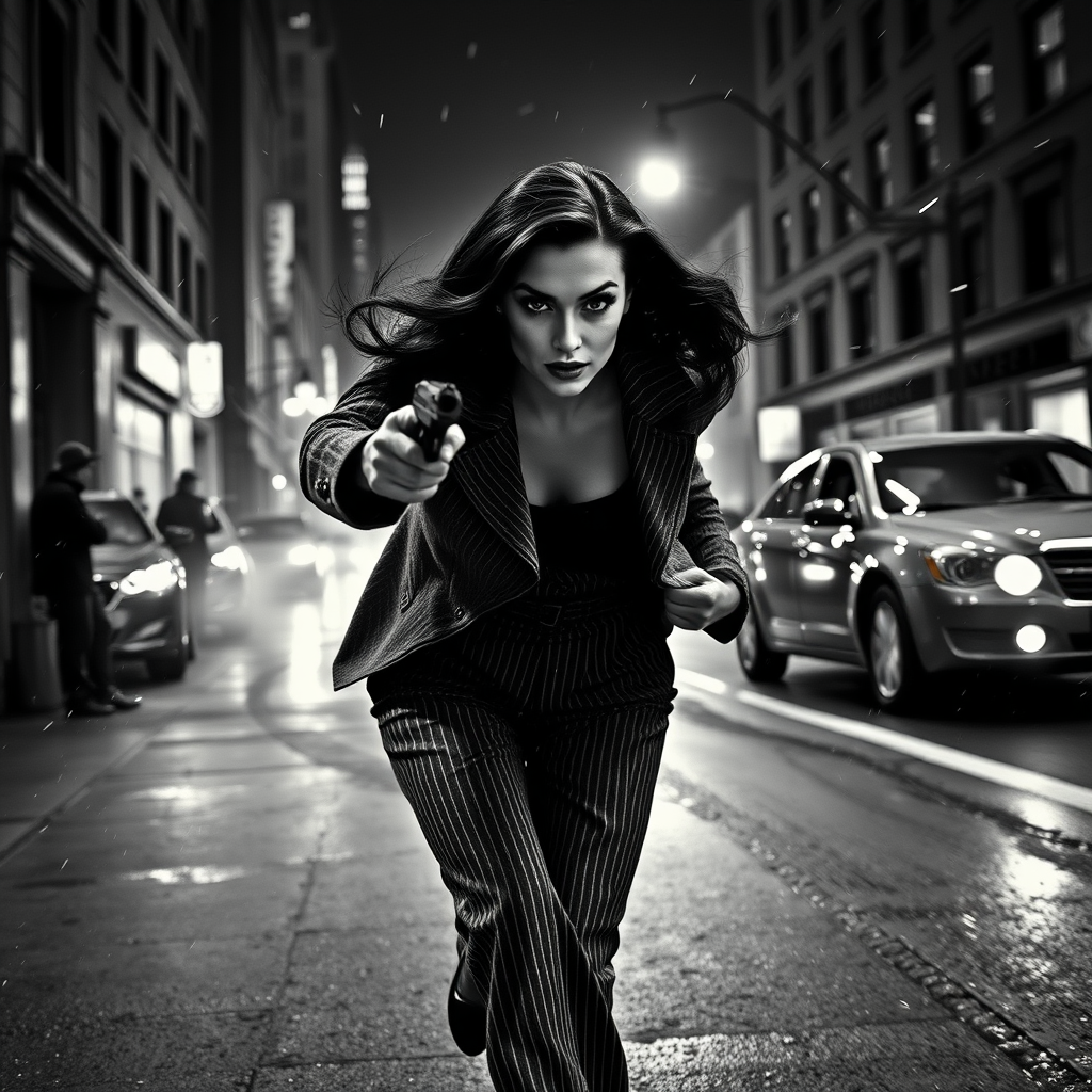 In the heart of a bustling 1940s city, under the glow of streetlights, a fearless Noir detective woman with striking freckles and long, shiny hair darts through an alleyway, narrowly evading a hailstorm of gunshots. Her dark, reflective eyes shine with determination, framed by dramatic makeup as mist swirls around her on the wet pavement. The scene captures the chaos and intensity of a gunfight with shattering glass and dust particles dancing in the air, illuminated by detailed rim lighting that adds depth to the black and white cinematography. Clad in elegant pinstripe trousers and a tweed jacket, she moves with agility and grace, embodying the essence of a classic film heroine. The high-contrast visuals focus on her beautiful face, emphasizing her resolve amid the atmospheric fog of the city. Modern cars speed by in the blurred background, contrasting with the timeless aura of the scene. This captivating image maintains a focus on artistic and technical excellence, portraying a vivid, immersive snapshot of suspense and drama without losing itself to distortion or exaggeration.