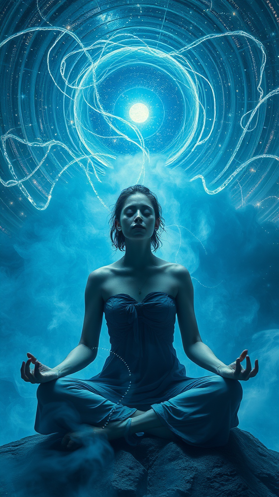 In the heart of a celestialpunk realm, where swirling indigo mists dance with shimmering silver threads, meditation reveals its own deepest secret. Surrealistic dreamlike scenes unfold beneath a vast cosmic canopy, where ethereal beings strike unconventional poses in a landscape beyond imagination. Starlit tendrils weave through the atmosphere, their luminescence casting an otherworldly glow on tranquil faces. Fragments of consciousness float amidst celestial bodies, merging with the fabric of dreams in an exquisite tapestry of serenity. Here, the essence of meditation transcends form, whispered through the silent language of the universe.