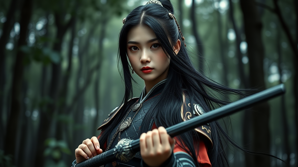 In the heart of a dense forest stands a female hwarang warrior, with flowing real black hair cascading down her back. Her pale skin contrasts beautifully with her deep brown eyes, which are framed by symmetrical and narrow angelic features. Her face, body, limbs, and fingers are impeccably proportioned, capturing an ethereal elegance. She dons a full set of battle gear, intricately detailed and radiant in ultra-realistic photography lighting. Every element of her outfit and weapon is crafted with precision, showcasing the highest detail quality. The scene is captured in a cinematic waist-length portrait, set in overcast daylight that enhances the photorealistic texture and depth created by reflection mapping and RTX ray-tracing lighting. The image possesses cinematic noise and movie-quality rendering with post-production VFX, focusing on subtle details that elevate the composition to an 8k resolution. The depth of field adds focus, with real shadows and textures completing the captivating portrayal.