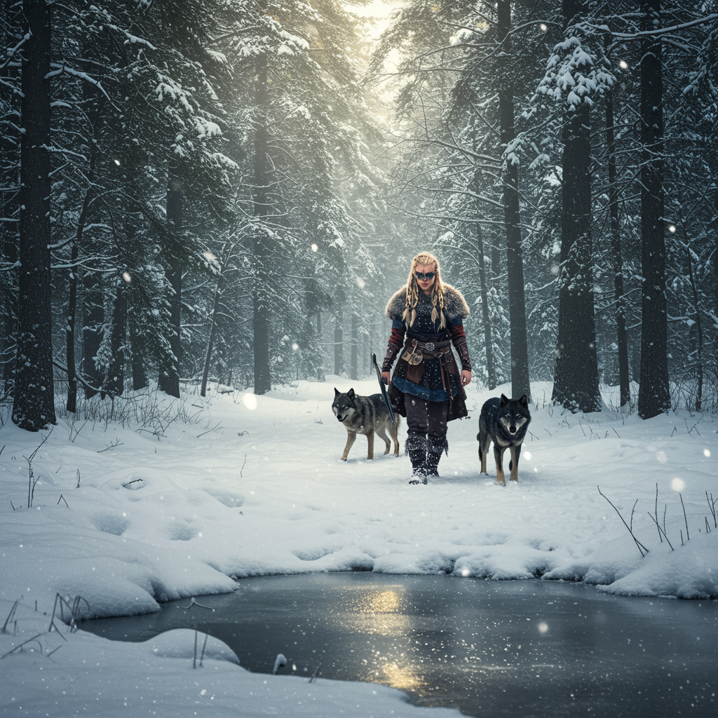 In the heart of a dense Nordic forest enveloped in winter's embrace, towering pines and firs stand sentinel beneath a thick mantle of fresh snow. A formidable Viking warrior woman strides purposefully through this icy realm, her long blonde hair intricately braided and interwoven with feathers, while her face bears striking war paint. Behind her pads a trio of sleek, black wolves, their eyes fierce but loyal. The air is crisp and almost unnaturally still, broken only by the soft murmur of wind gently stirring snow-laden branches. Streams of light pierce through the canopy, scattering golden flecks on the untouched snow below. The ground is a tapestry of life in winter, marked by the delicate prints of hares and deer curving through the otherwise unbroken expanse. Nearby, a slender stream, half-frozen, traces a shimmering path in the embrace of shadowed trees. The entire scene breathes an ethereal serenity, reminiscent of a winter legend woven from ice and silence.
