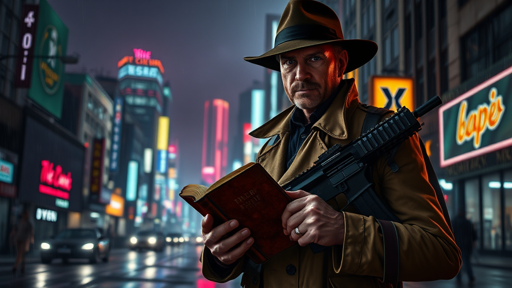 In the heart of a dystopian city, under a night sky shrouded in smog, a modern preacher stands with resolute determination. Neon billboards flicker in the distance, casting vibrant hues across rain-slicked streets reminiscent of a futuristic Blade Runner scene. The preacher, clad in a tattered trench coat, clutches a weathered Bible in one hand while a sleek, high-tech machine gun is strapped over his shoulder, blending the ancient with the modern. His eyes, shadowed by the brim of a battered fedora, reflect the chaotic dance of neon lights. The streets are deserted, save for the eerie hum of distant drones and the sporadic echoes of a city clinging to its last vestiges of hope. This hyper-realistic, cinematic tableau is rendered in ultra 4K, capturing every wrinkle of the preacher's determined face and every glint of neon slicing through the darkness.