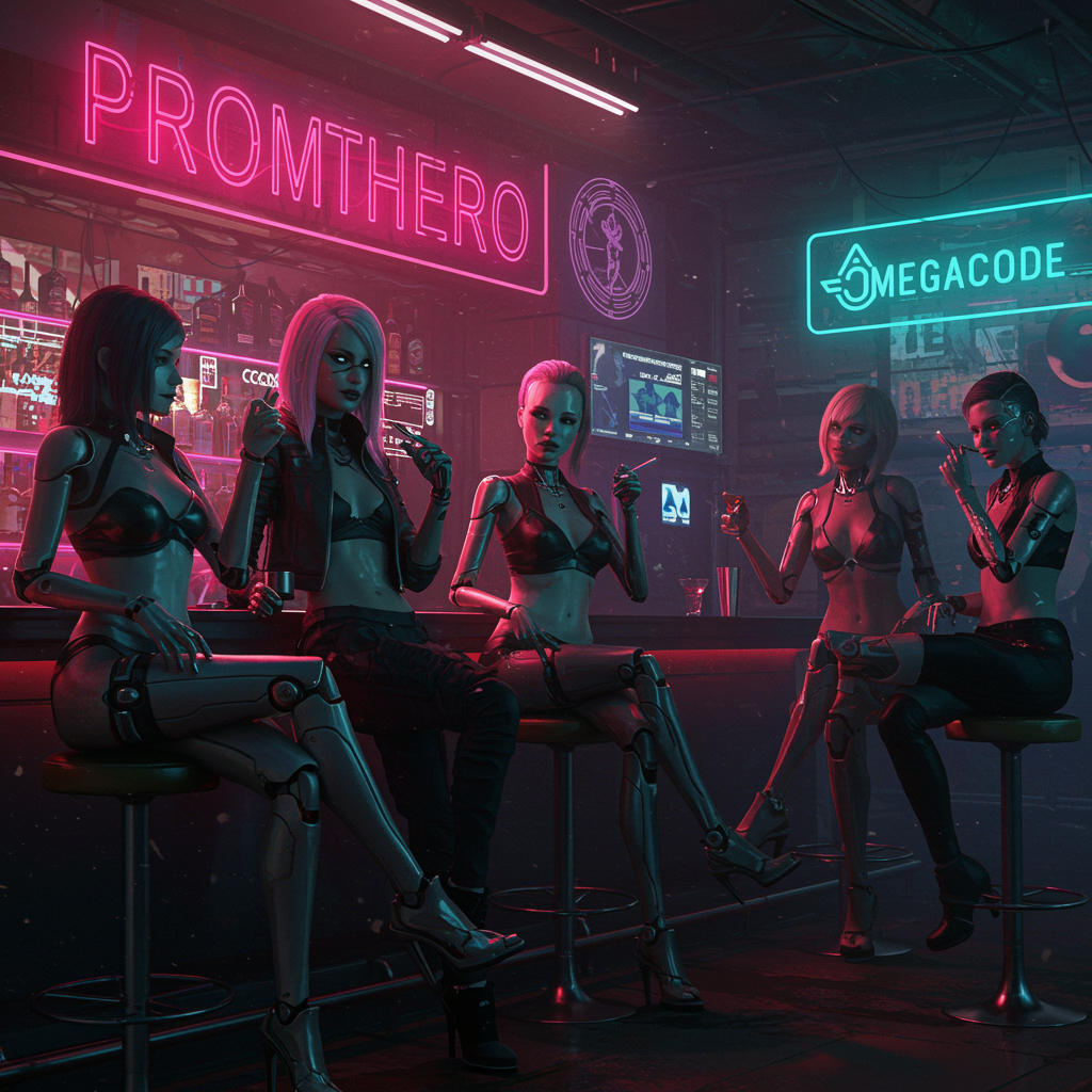 In the heart of a futuristic cyberpunk bar, a group of stunning women lounges at the counter, their cybernetic limbs glinting under the ambient light. Each one is dressed in avant-garde, stylish attire, seamlessly blending fashion with technology. One woman leans casually against the counter, a sleek drink in one hand and a thin, glowing cigarette in the other. The air hums with a mad neon noir vibe, electric and intense. Above, vivid magenta signs pulse with the name "PROMTHERO," while a cool teal sign nearby flickers with the word "OMEGACODE." The atmosphere crackles with energy, a kaleidoscope of colors and sounds that bring the night to life.