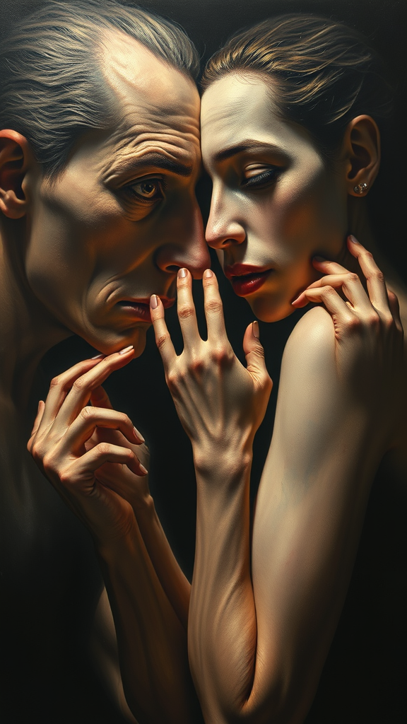 In the heart of a grand oil painting, two figures emerge, their features melded together in a surreal dance of duality. Each face is adorned with intricately sharp details, their eyes capturing endless memories that surge into the light from realms once shrouded in obscurity. The drama of the scene is magnified by striking lighting that casts sharp contrasts, highlighting the delicate brushstrokes that render each visage with photorealistic precision. Limbs entwine in an impossible embrace, too many to count, yet they twist with an elegance that defies the grotesque. Fingers multiply, stretching into the void, blurring the line between human and artifice, as though the figures are models sculpted from some synthetic material. Limbs drift in and out of frame, suggesting a journey beyond the confines of the canvas, where each articulated shadow captures echoes of lost narratives. Frail exceptions crumble like dust, ephemeral particles vanishing into the ether while the artist's name remains an indelible watermark of creation.