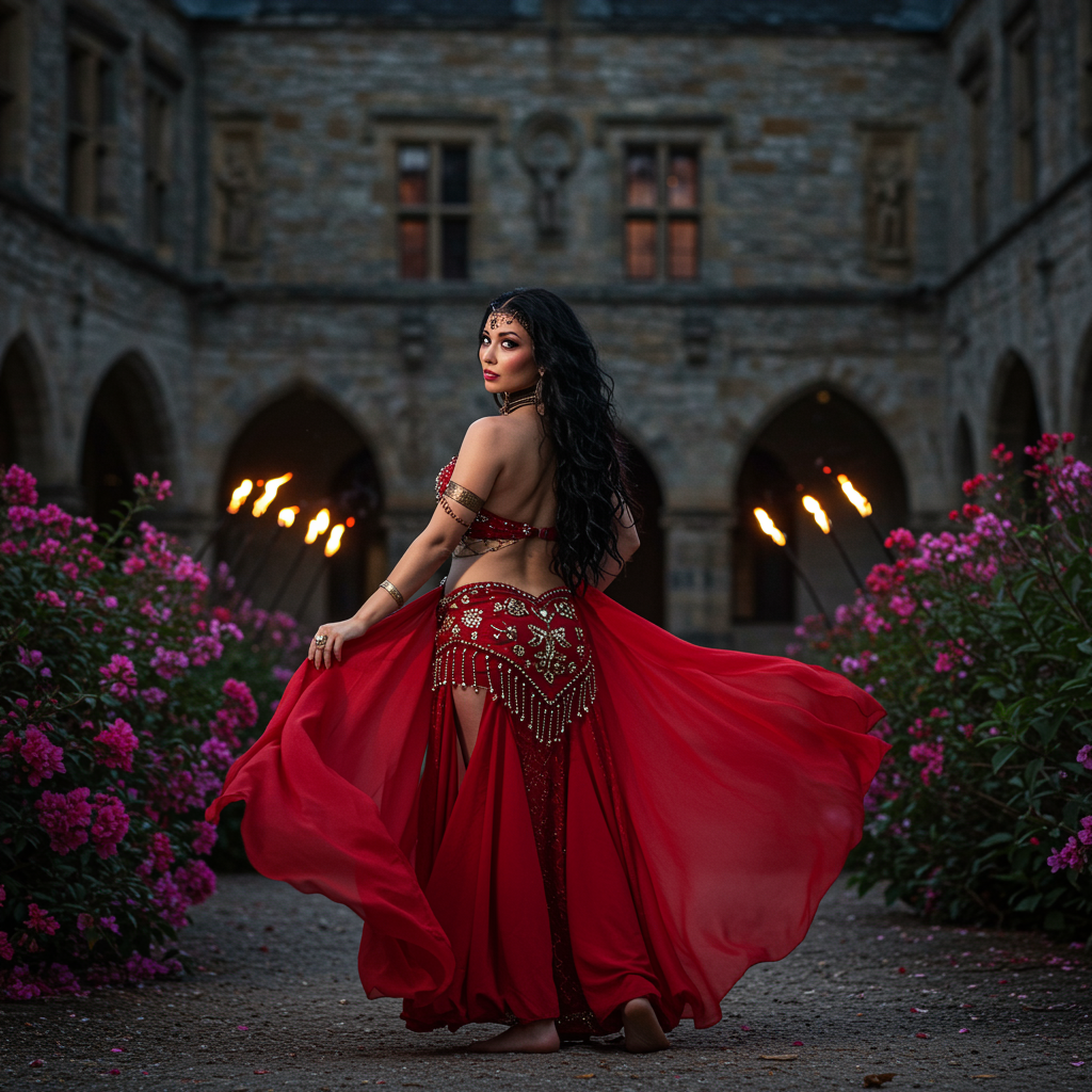 In the heart of a medieval castle courtyard, as the evening twilight settles in, a mesmerizing beauty stands enshrouded in a dance of moonlight, torchlight, and candle glow. Her red and gold belly dancing ensemble gleams with a whimsical luminance, and her barefoot stance is surrounded by blossoming, vibrant flowers. The radiant full moonlight softly caresses her form, accentuating her sensuous, inviting pose. Her gaze is captivating as it meets the viewer's from over her shoulder, her elegant neck adorned with an intriguing black band. Her hip-length, wavy raven hair flows gracefully down her back, catching the soft, diffused light that outlines her figure's curves. Captured using a Leica M10 paired with a Helios-44 58mm f/2 lens, gently stopped down to f/2.8, this fine art photograph reveals deep, rich hues and exquisite highlights, while the midday sun enhances her glowing expression, its rays filtering through her lustrous hair.