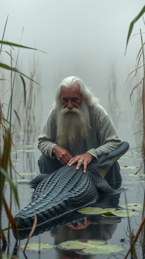 In the heart of a misty swamp, an elderly man with a flowing white beard gently caresses his loyal alligator, their serene connection a testament to years of companionship amidst the rustling reeds and the gentle murmur of the water.