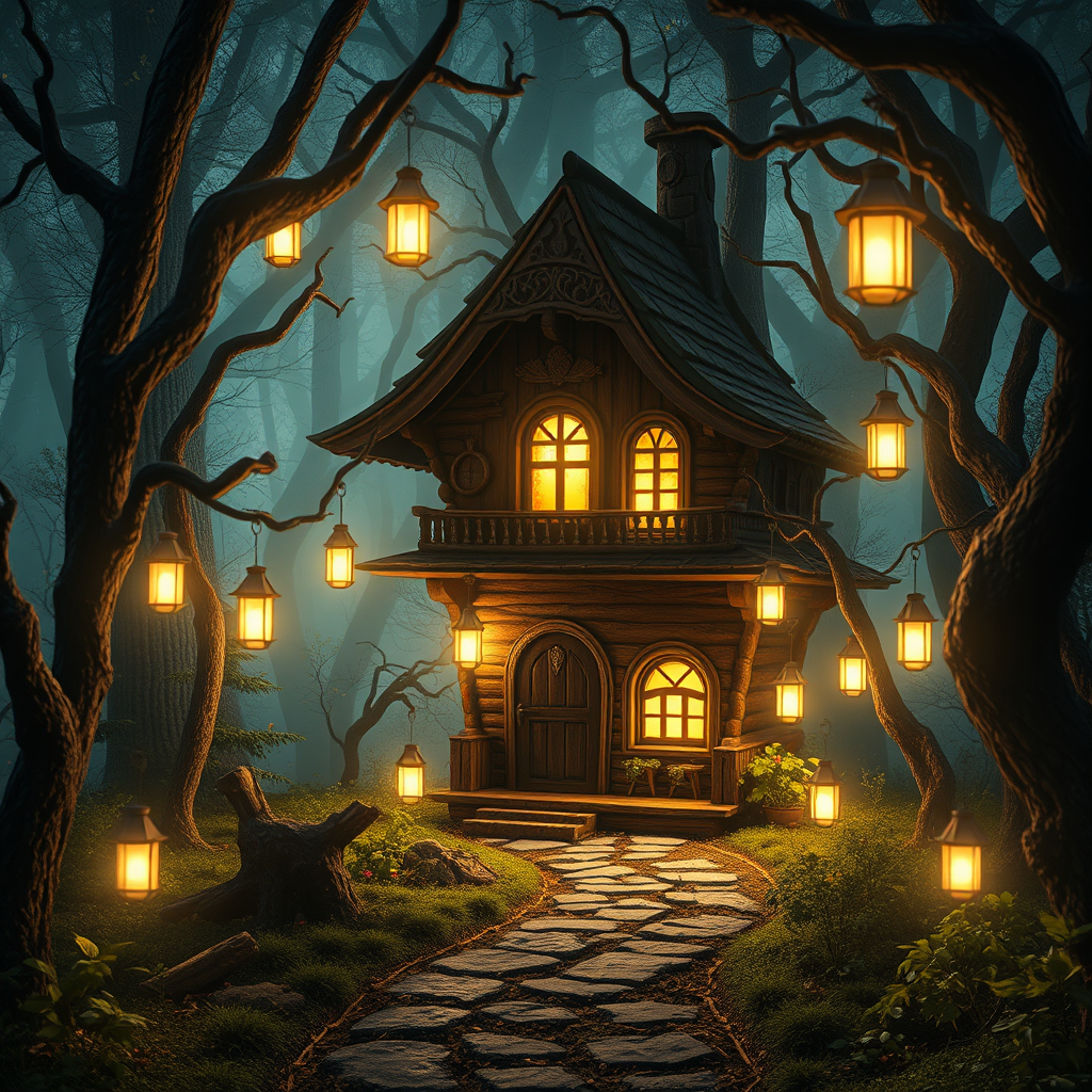 In the heart of a mystical forest, enveloped by an enchanting fairy tale wonderland, lies a small magical house radiating warm light amidst the dark, lush environment. This incredibly detailed wooden house, with its intricate carvings and whimsical architecture, stands as a beacon in the night, glowing softly from within. Lanterns hang from twisted branches, casting delicate patterns of light and shadow along a path leading to the house, creating a symmetrical view that draws the eye toward its captivating entrance. The scene is imbued with an ethereal beauty, achieved through maximum detail and photorealism, where the ambient occlusion and light rays filter through the canopy, achieving a cinematic glow. Bloom effects enhance the dreamlike quality as if the entire setting is bathed in a soft, magical aura, each element harmoniously contributing to a breathtaking and ambient tableau.