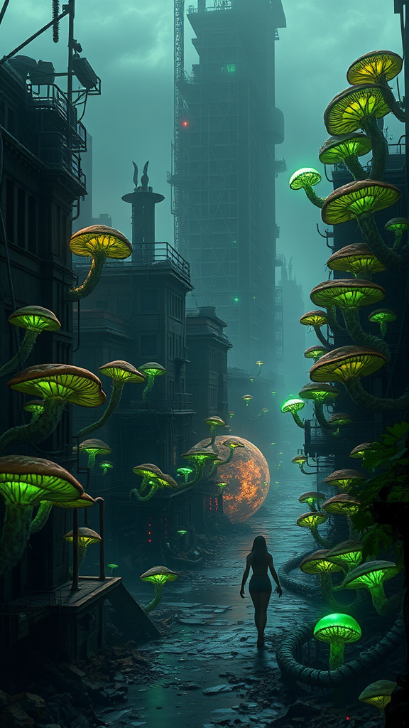 In the heart of a post-apocalyptic world, a city stands as a haunting testament to the virulent spread of a parasitic fungus that has hijacked the minds and bodies of its victims. This urban landscape, now known as Mycelium Metropolis, is overrun by grotesque, zombie-like creatures who move with a synchronized, unsettling rhythm dictated by their fungal puppeteer. Nature has reclaimed the streets, with tendrils of fungus weaving through the crumbling infrastructure, sprouting vibrant yet eerie bioluminescent growths that provide the only light in the choked darkness. Survivors navigate this perilous environment, desperately attempting to salvage what remains of their humanity while avoiding the watchful eyes of the infected. The air is thick with spores, and the very ground seems alive, pulsing with the insatiable hunger of the fungal network laced beneath. Amidst this decay, pockets of resistance struggle to comprehend the fungal infection, battling not only for survival but for the flickering hope that humanity can rise from the ashes of what once was.