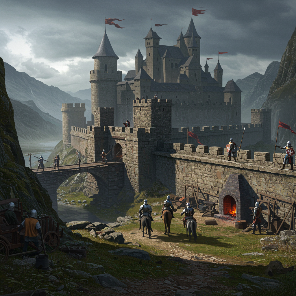 In the heart of a rugged landscape stands a formidable medieval castle, its towering walls casting long shadows over the surrounding land. A deep moat circles the fortress, its waters reflecting the steely sky above. The stout drawbridge, a critical lifeline to the outside world, stands ready to be raised at a moment's notice. Within the castle's imposing battlements, a contingent of knights in gleaming armor prepares for battle, their steeds restless and eager. On the high ramparts, archers sharpen their arrows, eyes scanning the horizon for signs of an advancing enemy. Blacksmiths toil over red-hot forges, their hammers ringing out in rhythmic defiance of the encroaching war. The air is thick with tension and anticipation, as the distant sounds of marching feet and clashing swords echo like a storm that looms ever closer, threatening to engulf the stronghold in the chaos of medieval conflict.