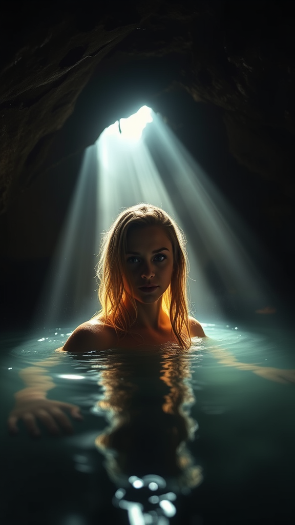In the heart of a shadowy cavern, a secluded hot spring shimmers in the dim light, its steamy tendrils dancing towards the rocky ceiling. A woman with cascading, damp blonde hair glides silently through the warm waters, her gaze meeting the onlooker’s with an enigmatic intensity. A gentle beam of sunlight pierces the cave's opening, casting a radiant glow that reflects off the rippling surface, enveloping her in a mysterious silhouette.