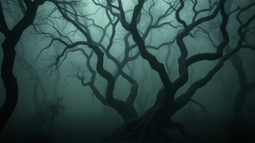 In the heart of a shadowy, enigmatic forest cloaked in thick mist, the air is filled with an unsettling quiet, broken only by the occasional rustle of unseen creatures. Twisted trees stand like ancient sentinels, their gnarled branches reaching out like skeletal fingers through the dense fog, hinting at secrets lost to time. An eerie, otherworldly glow filters through the canopy, casting ghostly silhouettes on the forest floor, where the damp earth seems to whisper forgotten tales. The atmosphere is charged with a sense of mystery, as if the forest itself is alive, watching, waiting.