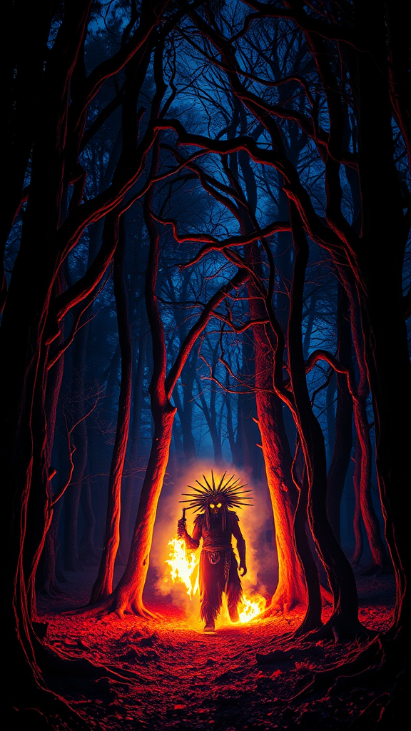 In the heart of a shadowy forest, a Native American evil spirit lurks, captured in the eerie luminescence of night photography. Intense colors saturate the scene, swirling in vivid energy explosions that light up the dense woods. The atmosphere crackles with the charged mystery of EC Comics, where dark blues and fiery oranges clash in electrifying harmony. The spirit, with glowing eyes and a ghostly silhouette, seems to pulse with life against the backdrop of twisted, ancient trees, their branches reaching out like skeletal fingers. The forest is alive with an otherworldly aura, every detail bold and vibrant, immersing you in a supernatural encounter vividly etched in color and light.