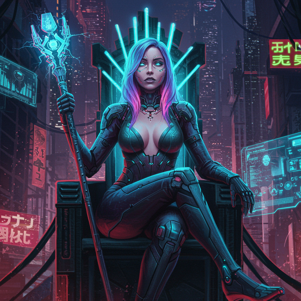 In the heart of a sprawling cyberpunk metropolis, a formidable queen reigns from her throne of pulsating neon lights. Surrounded by immense skyscrapers and flickering holographic displays, her presence is both commanding and enigmatic. Her luminous blue eyes, given an otherworldly allure by intricate cybernetic enhancements, survey her domain with calculated precision. Cascading around her shoulders, her hair shifts through a spectrum of vibrant hues, reflecting the kaleidoscope of neon brilliance. Clad in an elegant form-fitting suit, interwoven with sleek metal and complex circuitry, she exudes a sense of regal power. In one hand, she wields a radiant scepter that crackles with energy, a symbol of her undisputed dominion. Within this realm defined by relentless technology and glowing neon, she inspires awe and reverence, her authority unquestionable and her influence far-reaching.