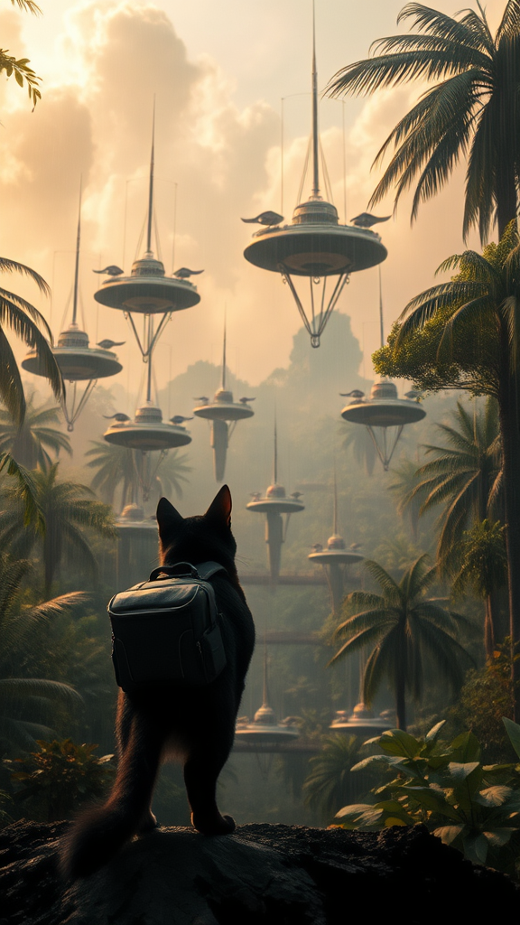 In the heart of a sprawling, futuristic jungle, a sleek feline stands poised, surrounded by towering trees and mysterious, hovering contraptions suspending from the lush, floating islands above. The atmosphere is charged, with golden-hued clouds swirling ominously, and a soft drizzle descends, glistening on the cat's fur as it stares in wonder at the peculiar airborne devices. A compact, black backpack nestles snugly against its back, offering a striking contrast to the vibrant scenery, the cat's silhouette captured in an expansive, cinematic frame.
