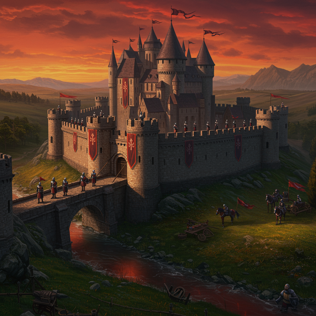 In the heart of a sprawling, verdant valley stands a formidable medieval castle, its towering stone walls casting long shadows under a crimson-hued sky. A wide, glistening moat encircles the stronghold, its waters rippling gently beneath the sturdy drawbridge lowered in anticipation of those who dare approach. Ascending from the battlements, rows of vigilant knights clad in gleaming armor glint in the fading light, their plumes fluttering like flames in the cool breeze. Sentinels armed with longbows patrol the ramparts, eyes sharp as hawks seeking any sign of encroaching danger from the distant horizon where the thrum of war drums is a haunting echo. Behind the parapets, the clang of blacksmith hammers rings out in rhythm, while cooks in smoky kitchens prepare for nights of feast and revelry. Horses stir restlessly in the stables, sensing the tension in the air as soldiers and serfs attend to their duties. In the castle's imposing keep, banners of the ruling house hang proudly, a symbol of resilience amidst the rising storm of conflict beyond the castle's protective embrace.