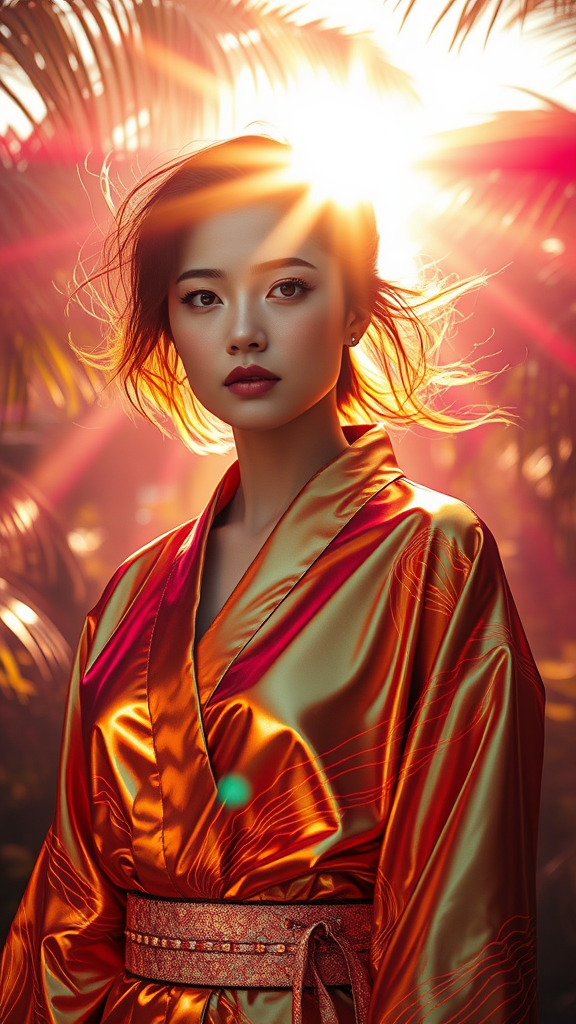 In the heart of a sunlit, enigmatic tropical landscape, a woman stands adorned in a glossy, metallic gold kimono that captures and refracts the solar brilliance around her. Her presence embodies cyberpunk realism, merging the organic with the digital; her attire hints at luminescent circuits running seamlessly across the fabric. The scene is infused with a glamorous Hollywood aura, reminiscent of photorealistic portraits brought to life, where every detail is meticulously rendered in the style of intricate digital manipulation. The setting conveys the vibrant hues of neon, a dreamscape reminiscent of Wong Kar-wai's evocative storytelling and Artgerm's masterful artistry. Intensely close-up, her expression blends mystery with grace, highlighted by the interplay of dark pink and light blue tones. This image, heavily inspired by the detailed character illustrations of Tanya Shatseva and the emotive allure of Daniel F. Gerhartz's works, exudes an explosive energy with wind-tousled rays playing around her, creating a dynamic, larger-than-life presence.