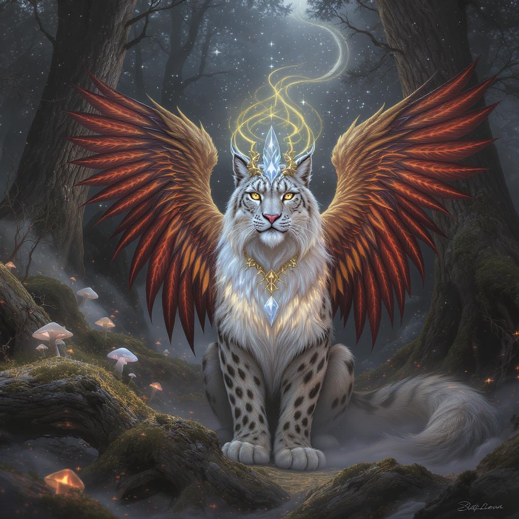 In the heart of an ancient, enchanted forest, there lives a breathtaking creature known as the Celestial Luminara. This enchanting being seamlessly blends the elegance and intellect of a wise sage with the nimble grace of a snow leopard, its sleek, silver-spotted fur shimmering under moonlit skies. It possesses radiant wings resembling those of a phoenix, glowing in vibrant hues of crimson and gold, lighting its path through the dark woods. The Luminara's eyes, deep and knowing, reflect the knowledge of centuries, offering guidance to lost wanderers. In its tranquil presence, the air is filled with a soft, melodic hum, a soothing symphony that calms both heart and spirit. On the creature's brow rests a single crystalline horn, capturing the essence of starlight and magic, serving as a beacon of hope and an emblem of untouched purity. This amalgamation of mortal wisdom, animal agility, and mythical wonder embodies the harmonious balance of nature's power and serene mystery.