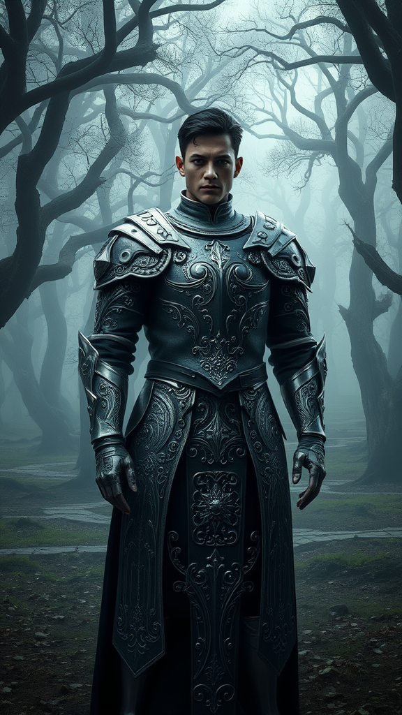In the heart of an ancient forest, amidst winding trails and towering trees shrouded in mist, stands a regal figure adorned in silver armor with intricate filigree, exuding an air of majesty. The world around is cloaked in shades of gray, casting an ethereal glow over the scene. The proud stance of the protagonist, with shoulders back and head held high, commands respect and intrigue. This digital masterpiece captures the essence of a dark fantasy realm, where shadows intertwine with whispers of forgotten legends, all bathed in a medieval aura. The composition embraces perfect symmetry, drawing the viewer’s gaze towards the central figure, as if guarding the secrets of an age long past.