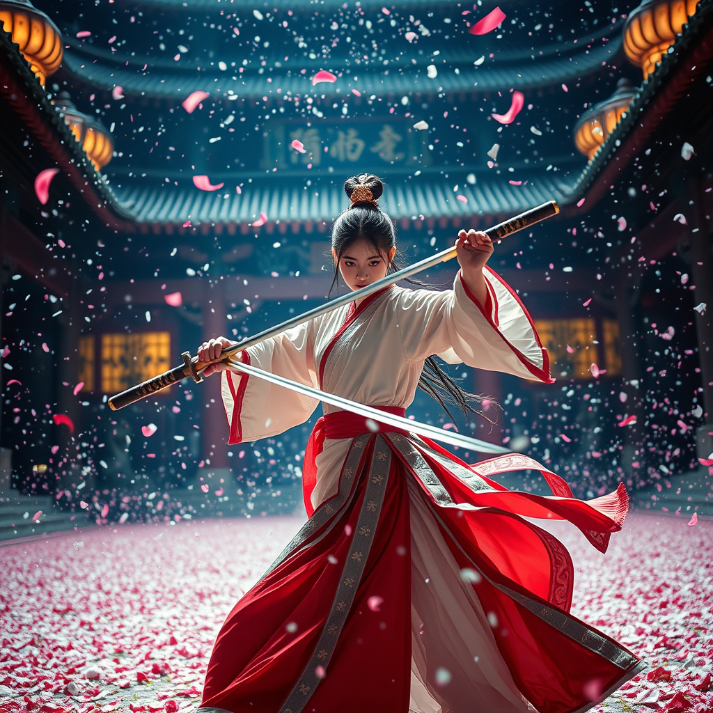 In the heart of an ancient temple, amidst a swirling storm of snow and petals, stands a 16-year-old Chinese girl, clad in exquisite Hanfu. She deftly wields her sword, embodying grace and strength in every movement, as she expertly defends herself with martial arts mastery. Her presence creates a powerful panorama, enveloped in cinematic lighting that highlights her beauty and skill. The colorful backdrop, reminiscent of a Chinese fairy tale, is alive with vibrant points of light that dance around her. This highly detailed scene captures the dramatic intensity of her battle, with realistic lighting and shadows adding depth and emotion. Shot in stunning 35mm, the image is both dynamic and breathtaking.