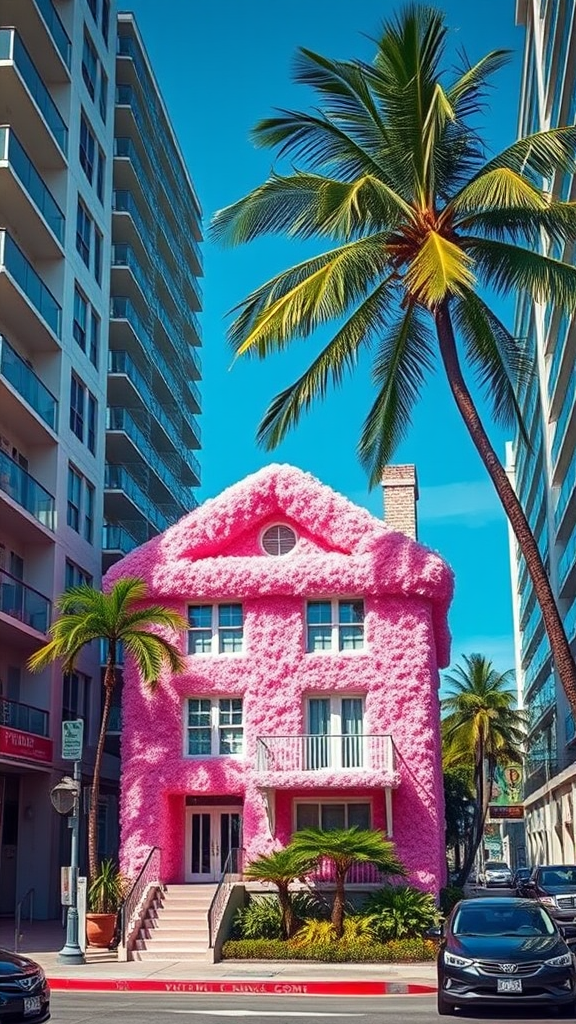 In the heart of Miami, a bustling city street reveals a whimsical sight: a two-story house adorned in vibrant pink faux fur, its texture shimmering under the sun. The playful exterior contrasts with the sleek, modern buildings surrounding it, drawing curious glances from passersby. Palm trees sway gently nearby, adding to the surreal charm of this cotton candy-colored abode nestled in the urban landscape.