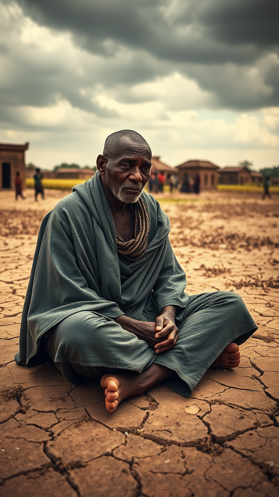In the heart of Olungwe's once-resplendent courtyard, a man of regal bearing yet worn by time sits cross-legged on the parched, cracked earth. In his late 50s, his visage is marked with both the dignity of a king and the exhaustion of a weary soul. Tears streak his gaunt cheeks, reflecting a lifetime of battles fought both on the field and within. His head is freshly shaven, revealing a jagged scar—a silent testament to a warrior's past. Draped in robes of deep, tattered gray, he embodies the very essence of mourning, the fabric whispering tales of despair. Encircling him, the kingdom's fields, once a tapestry of vibrant gold, now stand faded and forlorn, their stalks bowing beneath an oppressive gray sky. In the distance, villagers gather in muted hues, their expressions a mix of fear and reverence. A gentle wind stirs, lifting the dust around the king, carrying with it faint whispers of lost hopes and lingering sorrow.