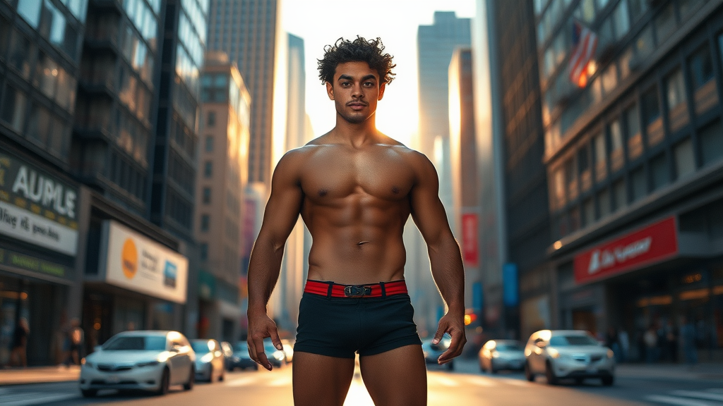 In the heart of the buzzing metropolis, a young man stands confidently in the late afternoon light. Strikingly handsome with a perfectly sculpted physique, he sports snug, revealing shorts that highlight his muscular frame. His face is chiseled to perfection, matched by his flawless hands. The sun bathes his short, black curly hair with a warm glow, casting a luminous sheen. As the sunlight cascades down, it accentuates the natural texture of his hairy legs and bare feet, grounding his presence in the urban landscape. Captured in an award-winning portrait photograph, the scene is brought to life using a Kodak Portra 800 film in a Hasselblad 500C camera, equipped with a 55mm f/1.8 lens. With an extreme depth of field and available light, the portrait is rendered in stunning high contrast. Presented in Ultra HD, HDR, with DTM, the image is encapsulated in breathtaking 8K resolution, offering a vivid exploration of the city's essence and the man within it.