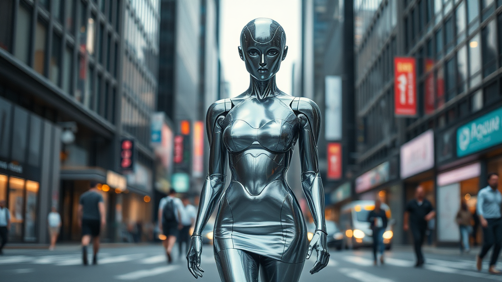 In the heart of the city, a sleek, faceless android glides effortlessly down the bustling streets. Her shiny silver metal body catches the light, reflecting a mesmerizing sheen as she moves. Dressed in a sleek mini skirt, she stands out amidst the urban backdrop, captivating onlookers. Her gaze, though featureless, seems to engage directly with those who pass by, evoking a sense of intrigue. Captured in a striking portrait with photographic precision, her metallic skin is rendered in stunning realism, each detail meticulously crafted. The image, shot in 8k resolution, boasts a sharp focus and a shallow depth of field, highlighting her in hyper-realistic splendor against the soft, diffused lighting of the city landscape. This cinematic composition achieves an impressive blend of photorealism and artistic vision, presenting a full-length view of the android. Despite the complexity of her design, the image avoids errors and imperfections, maintaining perfect proportions and anatomy, creating a seamless visual experience.