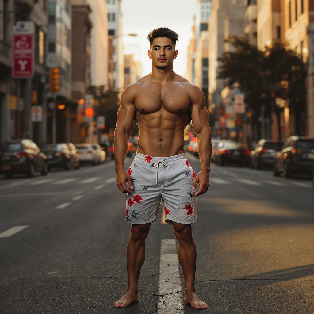 In the heart of the city during the late afternoon, a striking young man stands confidently. He is handsome, with a powerful, muscular build. His Mexican American, Latino heritage is evident in his features. Clad in eye-catching shorts highlighting his toned figure, he opts for no jewelry, allowing his perfect hands and face to stand out. The sun casts a warm glow on his short, black, curly hair, and the light gently illuminates his hairy legs, while his bare feet are visible against the urban backdrop. The scene is captured in an award-winning portrait photograph, shot on Kodak Portra 800 with a Hasselblad 500C, using a 55mm f/1.8 lens. The image boasts an extreme depth of field, utilizing available light to create high contrast. Rendered in Ultra HD, HDR, DTM, and 8K resolution, the photograph encapsulates a timeless and vivid portrayal.
