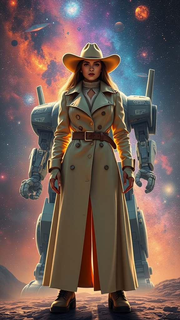 In the heart of the composition stands a cosmic cowgirl clad in a long trenchcoat and wide-brimmed cowboy hat, radiating confidence and resolve. She embodies a perfect blend of strength and elegance, standing with an aura that demands respect and admiration. Her outline is sculpted with smooth, dynamic curves, reminiscent of the formidable mech she commands. Her attire shimmers with an ethereal sheen, mirroring the brilliant kaleidoscope of colors found in the vast universe that envelops her.