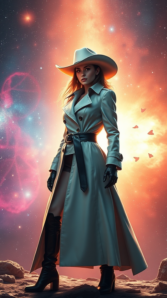 In the heart of the composition stands a galactic cowgirl, draped in a sleek trenchcoat and a wide-brimmed cowboy hat, radiating a blend of confidence and determination. She embodies a powerful yet graceful presence, standing tall and effortlessly commanding the scene. Her silhouette is sculpted with aerodynamic precision, mirroring the formidable Gundam she commands. Her costume glistens with a pearlescent glow, capturing the magnificent array of cosmic colors from the vast universe surrounding her.