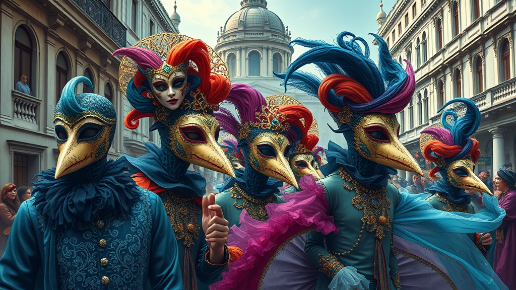 In the heart of Venice, a majestic carnival unfolds, where ornate masks and lavish attire transform the city into a living tapestry. Set against grand, baroque architecture, the scene is reminiscent of James Gurney’s intricate cityscapes, infused with Camille Rose Garcia’s vibrant whimsy and the opulent mysticism of Kinuko Y. Craft’s dreamlike visions. Rich navy blues and shimmering aquamarine dominate the palette, adorned with delicate gothic filigree and ornate spiral patterns. A diverse cast of characters with distinctive, elongated noses weaves through a whirlwind of colorful silks and velvets, as if emerging from the pages of a fantastical tale, capturing the essence of a magical, carnivalesque dream.