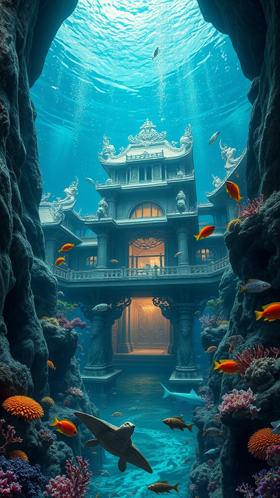 In the hidden depths of the ocean, an opulent underwater palace perches majestically atop a submerged mountain. At its grand entrance stands a colossal stone lion, embodying the regal power of its realm. Inside, the palace dazzles with intricate design; dragon columns are carved with enchanting mythical beings that seem to be secretly observing the happenings within. Every corner of the palace presents a unique ambiance—there's a serene river winding through, complemented by a tranquil garden illuminated with lights that mimic the twinkling cosmos. Multitudes of fish glide gracefully in the water, and vibrant corals and shimmering shells adorn the palace like masterful works of art. The atmosphere is otherworldly and enchanting, reminiscent of a journey to an ethereal kingdom. A multitude of marine life, from elegant turtles to swift sharks, glides through the bubbles that dance and shimmer in this underwater realm.
