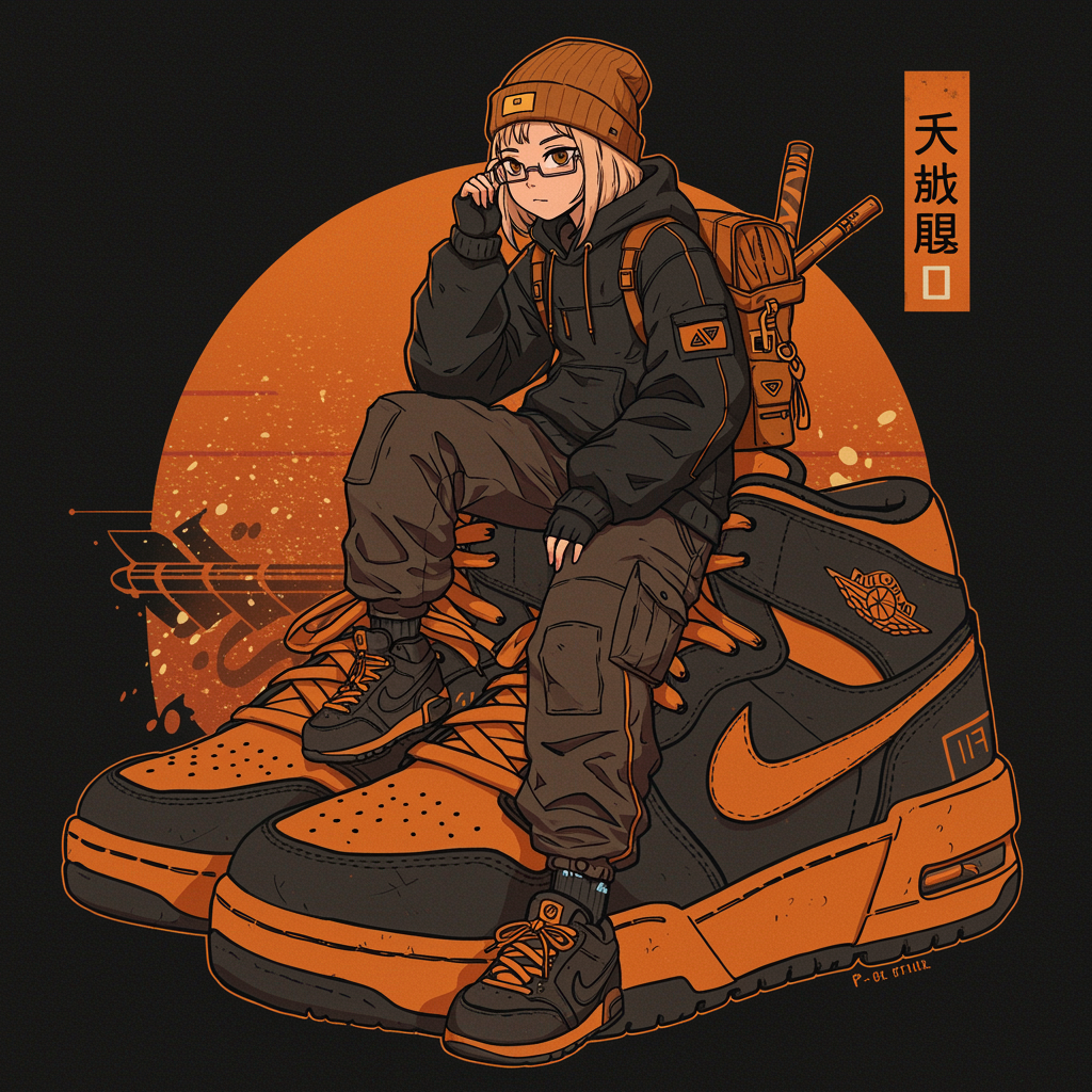 In the image, a girl is perched atop a pair of oversized sneakers, drawn in an anime style reminiscent of ukiyo-e art with a futuristic twist. She is clothed in a techwear-inspired ensemble, including a sleek hoodie, work pants, and a snug beanie, harmonizing with her sporty yet cute aesthetic. Her face possesses a distinctly adorable and anime-like charm, framed by her stylish hat. The color palette is a striking blend of deep oranges and blacks, infusing the scene with a dynamic energy. The artwork, shared on Tumblr, demonstrates an artful fusion of modern and traditional elements, created by an artist named Mike, whose work channels the intricate style of Tsutomu Nihei while introducing a unique and personal touch.