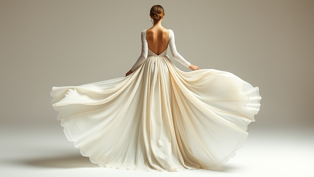 In the image, a woman stands elegantly in a floor-length cream gown, the fabric draping gracefully around her. The dress showcases a high neckline and elongated sleeves, with an unexpected open back, revealing a glimpse of skin with subtle allure. Cascading down to the ground, the dress features a sweeping train that unfurls behind her like a fluid wave. The layered fabric is skillfully arranged, suggesting movement and conveying a sense of ethereal depth, as if the gown itself is dancing in a gentle breeze. Delicate embroidery decorates the hem, adding a touch of intricate artistry to this enchanting attire.