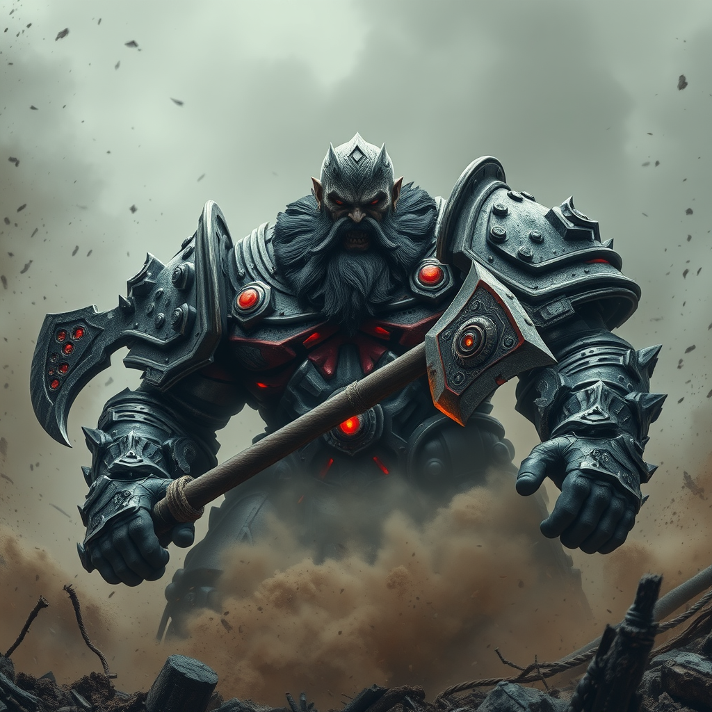 In the midst of a chaotic and apocalyptic landscape, a hyper-realistic photograph captures Worldbreaker Sion, his massive and towering physique dominating the scene. His intricate armor gleams ominously under advanced lighting techniques, accentuating every brutal angle and imposing detail. Clad in dark, weathered metal, with crimson veins pulsating through his armor, Sion wields his signature axe, its edge glowing menacingly. His fierce and unrelenting expression, carved with determination and wrath, speaks to his indomitable power and capacity for destruction. The photograph uses a muted and desaturated color palette, punctuated by splashes of vivid red and deep black, to enhance the sense of impending doom. Sion's dynamic pose amidst swirling dust and debris further amplifies the atmosphere of catastrophe, making small creative modifications to ensure the core concept of his world-ending presence is vividly felt.