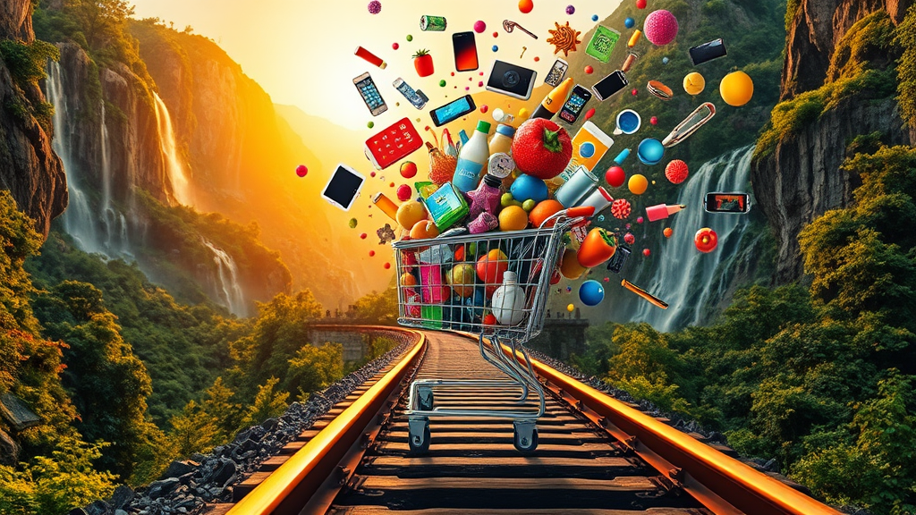 In the midst of a lush, mountainous landscape, a vibrant and surreal scene unfolds along a dramatic railway track. Cascading waterfalls shimmer against the backdrop of verdant greenery, while the setting sun bathes the picturesque vista in a warm, golden hue. Perched dynamically on the tracks is a shopping cart, overflowing with an array of colorful items—all symbols of e-commerce's abundant excess. The cart teems with an eclectic mix: vivid fruits, crisp vegetables, sleek electronic gadgets, various household items, and bursts of bright, paint-like textures that seem to defy gravity. This kaleidoscope of products explodes upwards, creating a vibrant trail that soars into the sky. The scene is alive with dynamics and depth, as the density of floating items forms a dizzying spectacle of commercial opulence. Every texture and material captures the light with hyper-realistic precision, emphasizing the elongated shadows cast by the golden glow of the sunset. This fantastical tableau exemplifies overwhelming vibrancy and kinetic energy, a stunning testament to surrealism and modern fantasy.