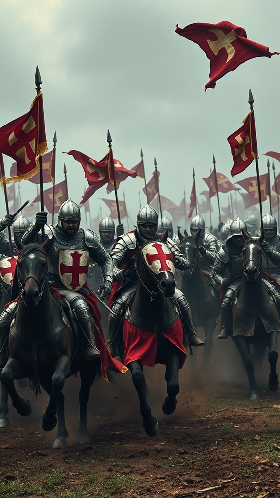 In the midst of a medieval clash, valiant knights of the Templar order charge with determination into the fray, their steeds pounding the earth beneath them. The air is alive with the flutter of Templar flags bearing the distinctive red cross, symbolizing their Christian faith. Clad in meticulously crafted armor that glistens under the bleak sky, they epitomize the chivalry and fervor of the 1150s. Echoes of ancient secrets linger, invoking whispers of the Illuminati amidst the chaos. This thrilling scene could be a masterpiece rendered in Unreal Engine, capturing the essence of fearless battle.