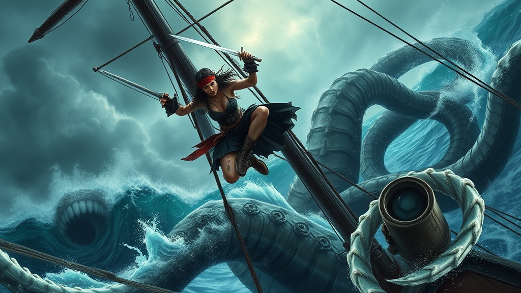 In the midst of a raging Caribbean storm, a daring and resolute female pirate captain, adorned with intricate tattoos and garbed in attire reminiscent of Jack Sparrow, balances on the wind-whipped mast of a Spanish galleon. Her fierce, dark eyes lock onto the monstrous Kraken below, a chaos of sinewy tentacles thrashing in the tumultuous waves. She leaps fearlessly into the stormy air, her saber clutched firmly in both hands, poised to strike down with unwavering determination. The Kraken, a formidable creature from the abyss, surges upward towards her vessel, its intentions menacing. Her battle cry pierces the thunderous sky as she dives in a perfect arc, her blade aimed with precision at the leviathan's grotesque head. Illuminated by staccato bursts of lightning, she becomes a blur of fury and steel, a striking figure descending upon the ancient terror with the force of a tempest.
