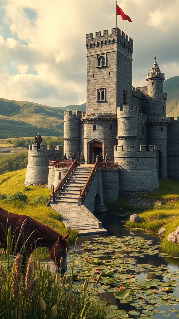 In the midst of a rolling, verdant landscape, there stood a majestic medieval castle, its towering walls rising imposingly against the cloudy sky. This fortress, surrounded by a glistening moat teeming with reeds and water lilies, was accessible only by a sturdy drawbridge that creaked under the weight of armored knights and their steeds. Standing sentinel, these knights gleamed in the pale sunlight, their armor clinking softly as they moved with disciplined grace, ever watchful for threats. On the castle ramparts, skilled archers stood poised, their keen eyes scanning the horizon for any sign of impending danger. Amidst the bustling courtyard below, blacksmiths diligently hammered away at glowing metal, the clang of steel on anvil resonating like a battle hymn, as stable hands tended to restless horses. The air was charged with the tense anticipation of background war, the distant echo of clashing swords and shouts a sobering reminder of the ever-present conflict that loomed just beyond the castle’s stony embrace. Yet, within these fortified walls, a community thrived, their lives interwoven with the very essence of medieval life.
